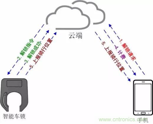 1.手機先掃單車上二維碼,而后向云端發起解鎖請求。(步驟1)