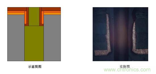 (1)整板板電銅薄孔無銅―――表銅及孔銅板電層都很薄,經(jīng)圖電前處理微蝕后孔中間大部分板電銅都被蝕掉,圖電后被圖電層包住;