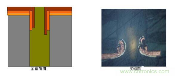 (2)蝕檢修懷孔―――表銅板電層均勻正常,孔銅板電層無拉尖趨勢,斷口處不規(guī)則,可能出現(xiàn)在孔口也可能出現(xiàn)在孔中間,在孔壁上往往會出現(xiàn)粗糙凸起等不良,斷口處圖電層未將板電層包住。