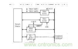 CLB是FPGA內的基本邏輯單元。CLB的實際數量和特性會依器件的不同而不同,但是每個CLB都包含一個可配置開關矩陣,此矩陣由4或6個輸入、一些選型電路(多路復用器等)和觸發器組成。 開關矩陣是高度靈活的,可以對其進行配置以便處理組合邏輯、移位寄存器或RAM。在Xilinx公司的FPGA器件中,CLB由多個(一般為4個或2個)相同的Slice和附加邏輯構成,如圖1-3所示。每個CLB模塊不僅可以用于實現組合邏輯、時序邏輯,還可以配置為分布式RAM和分布式ROM。