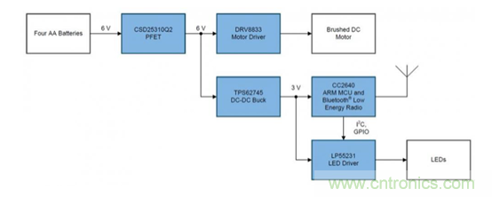 電機驅動器:驅動電流、電源電壓范圍、負載電機類型和安全關閉功能都是選擇電機驅動器時的因素。DRV8833可以驅動多種類型的電機和感性負載,峰值電流為2A,電源電壓范圍為2.7V至10.8V,非常適合使用四節(jié)AA電池。標稱驅動電壓電池的電壓是5V。