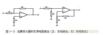 其次,由于放大倍數(shù)為無窮大,所以不能將運(yùn)算放大器直接用來做放大器用,必須要將輸出的信號(hào)反饋到反相輸入端(稱為負(fù)反饋)來降低它的放大倍數(shù)。如圖1-3中左圖所示,R1的作用就是將輸出的信號(hào)返回到運(yùn)算放大器的反相輸入端,由于反相輸入端與輸出的電壓是相反的,所以會(huì)減小電路的放大倍數(shù),是一個(gè)負(fù)反饋電路,電阻Rf也叫做負(fù)反饋電阻。