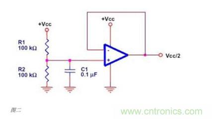 單電源工作的運(yùn)放需要外部提供一個(gè)虛地,通常情況下,這個(gè)電壓是VCC/2,圖二的電路可以用來產(chǎn)生VCC/2的電壓,但是他會(huì)降低系統(tǒng)的低頻特性。