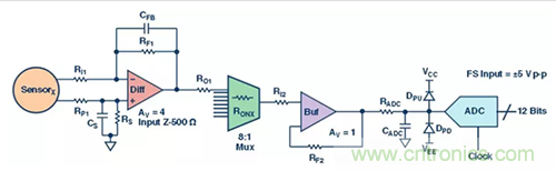 圖 1 是一種可以達到 0.1% 精度要求的簡單數據采集系統,也就是說,每輸入 1V 的電壓,輸出要么為 0.99388V,要么為 1.00612V。因此,轉換器規定的動態范圍為 60dB 或 9.67ENOB,假設其滿量程電壓為 10 V。轉換器有兩個放大器級、一個多路復用器和一個 ADC。本分析將忽略傳感器、電纜、連接器、PCB 寄生電容和任何外部影響/誤差,因為這些情況在很大程度上取決于我們要測量的具體應用或信號。