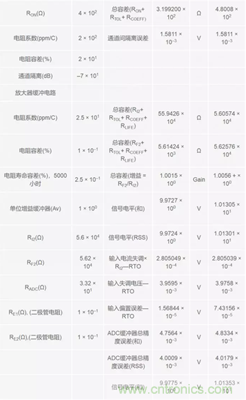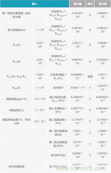 往下,在表格左側,把所有誤差細分到各電阻級。電阻誤差也細分到了各個級,以便于了解相應的權衡情況。右側所示為在信號流進流出各級時連讀計算和累計計算的誤差。