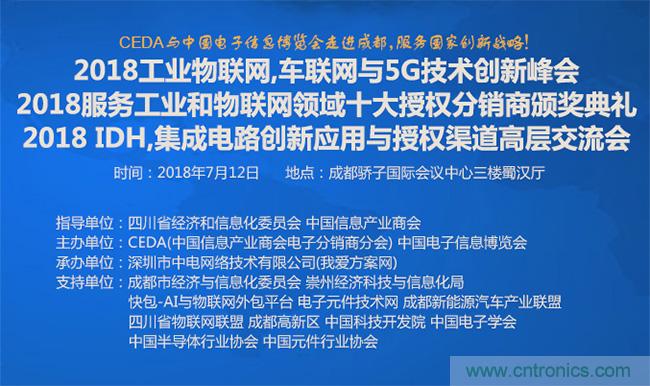 【導讀】中國芯片產業如何快速騰飛?CEDA認為,通過應用方案和授權渠道能快速占領市場。作為電子元器件的授權代理商協會組織,CEDA在中國信息產業商會的領導下服務國家創新和供應鏈戰略。7月12日(中國電子信息博覽會期間),CEDA將在成都世紀城驕子國際會議中心舉辦2018工業物聯網, 車聯網與5G技術創新峰會,嘉獎服務工業與物聯網領域的優秀電子元器件授權分銷商并舉辦IDH,芯片設計公司,元件公司和授權代理商高層的交流會。