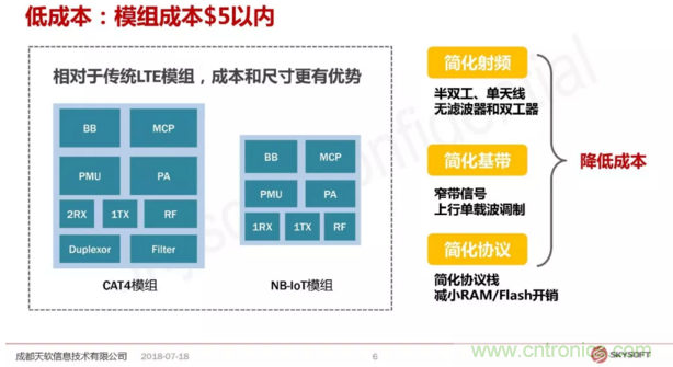 黃總總結了三個原因:射頻相對比較簡單,它沒有濾波器,它是單天線的方案,這個和用4G來做物聯網的技術是有明顯的差別。第二是基帶比較簡單,第三是簡化的協議。