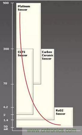 圖1:多種材料可用于測量超低K值的溫度,注意垂直刻度不是線性的。CLTS是一種低溫線性溫度傳感器,即由錳銅和鎳箔傳感網(wǎng)格組成的扁平柔性傳感器;RuO2是氧化釕。(圖片來源:ICE Oxford Ltd.)