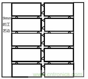 工藝邊用于在自動化貼片時,貼片機需要夾住板子的邊緣進行貼片,通常只需要加兩邊即可。工藝邊寬度的選擇通常比較寬泛,可以選常用的9mm。注意工藝邊只是在貼片生產時用到,在元件組裝完后就可以掰掉的。開發人員在畫板子的時候不需要把工藝邊給畫上去,但是需要在發給廠家的文件中需要注明。工藝邊如下圖所示: