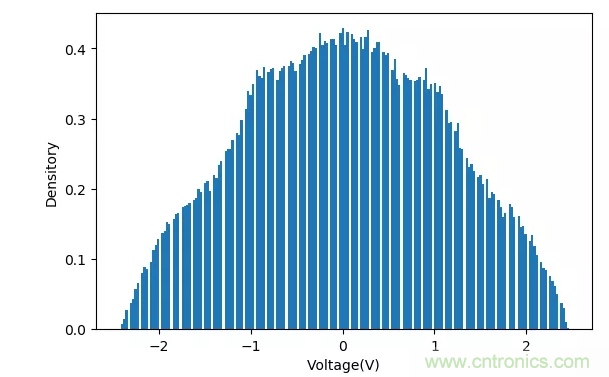 使用示波器采集上面隨機(jī)噪聲信號(hào)280k個(gè)數(shù)值,發(fā)送到計(jì)算機(jī)。統(tǒng)計(jì)它們的直方圖分布如下圖所示。
