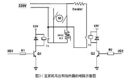 下圖3為多功能豆漿機馬達和加熱器的簡單電路示意圖。豆漿機所用馬達為220V直流馬達,繼電器的工作電壓為12V,豆漿機利用繼電器把MCU發出的低壓控制信號I/O來控制交流高壓信號的通斷,R3為PPTC可恢復電阻,T1和T2為繼電器。