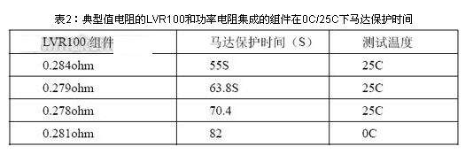 其次選取典型值電阻的LVR100和功率電阻集成的組件,來進行0C/25C溫度下榨水果馬達堵轉保護時間,下表2為馬達的保護時間。