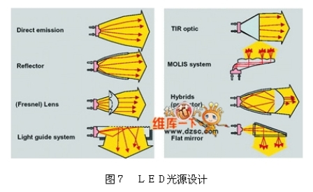 光學設計時先考慮法規需求,討論視角與強度關系,以近燈為例須針對其特殊的15度揚角設計,如圖5所示。在傳統的燈具設計上由先期的利用反射罩配合透鏡刻紋作角度與強度的控制,演變成為利用反射罩直接控制強度角度,也發展出利用成像方式的魚眼透鏡設計法。不論何種的設計方式都須先考慮選用光源的特性,特別是角度與強度的光型輸出(Beam pattern),對傳統的光源而言,大多為柱狀光源,可產生類似蝴蝶外型的光型輸出,進而發展出來與之搭配的透鏡、反射罩、擋板、透鏡等光學組件。而利用LED作為光源設計燈具時,需重新考慮其光學特性由傳統的柱狀光源變為平面光源(不同的封裝設計有不同的光型輸出),進而搭配外部的光學組件而產生不同組合以應用于不同產品,依照德國車燈大廠HELLA的設計分類,可將光源分為八大類,如圖6 所示。LED目前的單位面積發光量尚不及鹵素燈泡與放電式燈泡,想得到相同的流明輸出,LED需要較大的封裝面積。隨著光源輸出面積的增加,光學設計的難度也隨之提升,所以在現有的概念車上,都以模塊化光學設計取代既有的單一燈室設計,利用多組燈源達到傳統燈具的照明水平,除了降低光學設計的難度,也增加車體造型的設計感。