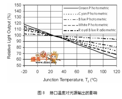 散熱設計是LED光源區別于傳統光源的課題之一。傳統燈具產生的熱遠高于LED,但傳統燈具不會因為高溫而降低其光源輸出能力,但LED的光輸出卻會隨著本身接口(Junction, PN接口)溫度的升高而下降,如圖8所示。而其產生的熱如何散除到外界環境與其封裝結構材料息息相關,牽涉到使用的散熱材料與相關外型,關系如圖9所示,其中熱阻的概念,代表輸入W功率時,需要提高多少K溫度才足以散熱。以現有的封裝技術最高可允許LED操作在185℃(Lumiled K2),但一般因為封裝膠材的關系,可允許的操作溫度約在125℃,除了考慮光源輸出效率之外,亦考慮封裝膠材的變質(樹脂類材料在高溫有老化現象)。