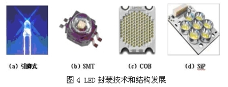 經(jīng)過40多年的發(fā)展,LED封裝技術(shù)和結(jié)構(gòu)先后經(jīng)歷了四個(gè)階段,如圖4所示。