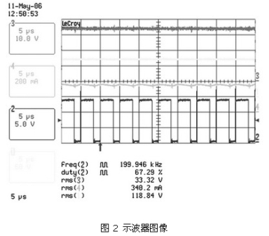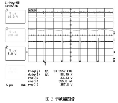 圖 2 、圖3 及表 2、表3 顯示了這種電路在90 ~265 VAC的通用輸入電壓范圍內,以350 mA驅動兩個有6個串聯LUXEON FLOOD 25-0032 HB-LED板時的結果。表 2 顯示了在輸入電壓范圍內良好的電流調節。圖 2 和圖3 說明了正如理論所示的,由于占空比較小,輸入電壓較高時紋波較差。這表明在主電壓較低的地區,如北美和日本,設備性能更加良好。然而,即使在最差的條件下,只要控制器輸入電壓保持在90 ~265 VAC的范圍內,仍可對電流進行適時調節。同時對只使用6個HB-LED板的系統進行了測量(見表 3) ,對比結果發現,±1.3%的調節差距導致負載電壓的差距高達33.4V ~16.4V。
