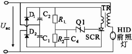 啟動期間,電子鎮(zhèn)流器要經(jīng)歷高壓擊穿、電流接續(xù)、預(yù)熱維弧3個階段。高壓啟動電路是HID 前照燈能否瞬間點(diǎn)亮的基礎(chǔ)。但輝光放電后慣性和濾波延遲使直流變換器和檢測回路很難有較快的響應(yīng)速度,所以需要如圖1所示的電流接續(xù)(take-over) 電路,它可利用電容預(yù)先儲存的能量為燈提供一個較大的瞬間電流(約300ms) ,保證輝弧可靠過渡。一般高壓發(fā)生電路有以下幾種:
