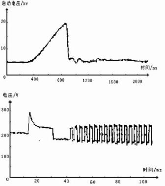 圖5采用3倍壓整流電路,放電管的額定擊穿電壓為600V ,高壓包的匝數(shù)比1∶50 ,放電管擊穿電壓為600V。實(shí)驗波形見圖6。