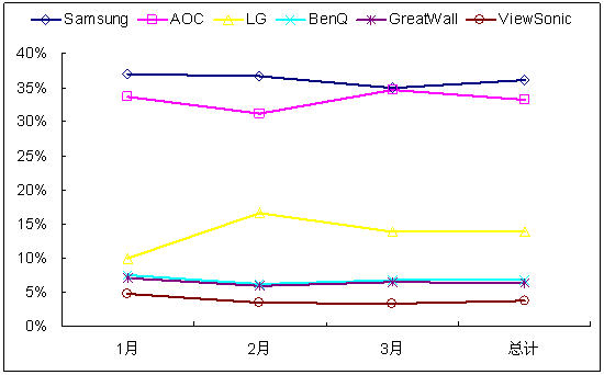 圖1 2009年1-3月中國(guó)LCD顯示器主流自有品牌市場(chǎng)份額變化