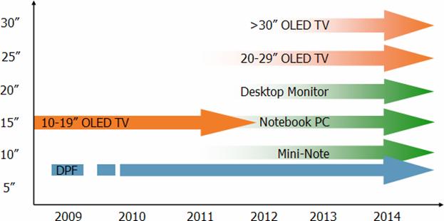 隨著技術進步,DisplaySearch預估AMOLED將進一步朝中大尺寸方向發展。筆記本計算機將是AMOLED廠商下一個關注的應用方向,我們估計自2010年年中,廠商將有機會將AMOLED應用在筆記本計算機上,而采用AMOLED面板上網本將有機會于2010年底開始量產。在TV方面,我們預期2010年底將會有大于20寸AMOLED TV被生產,同時預期2011年大于30寸AMOLED TV 將會進入市場中。