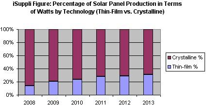 到2013年,在全球太陽電池板市場上,薄膜的效率將從2008年的14%增加到31%。下圖所示為iSuppli公司對全球太陽能電池生產中薄膜和晶體技術所占比例的預測。