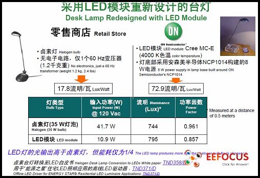 在現場,Laurent Jenck 展示了兩款從零售商店購得的鹵素臺燈(采用35 W燈泡)。一款采用原鹵素燈,另外一款則采用了安森美NCP1014芯片進行穩壓改進。原鹵素燈在120 Vac條件下的輸入功率為41.7 W,在0.5米距離處測得的光亮度為744流明。采用了自供電單片式開關穩壓器的臺燈在120 Vac條件下輸入功率為10.9 W,即能耗僅相當于鹵素燈的1/4;同時,這LED臺燈在同等距離條件下測得的光亮度為795流明,更優于鹵素燈,其72.9流明/瓦(lm/W)的能效(efficacy)更是數倍于鹵素燈(17.8 lm/W)。