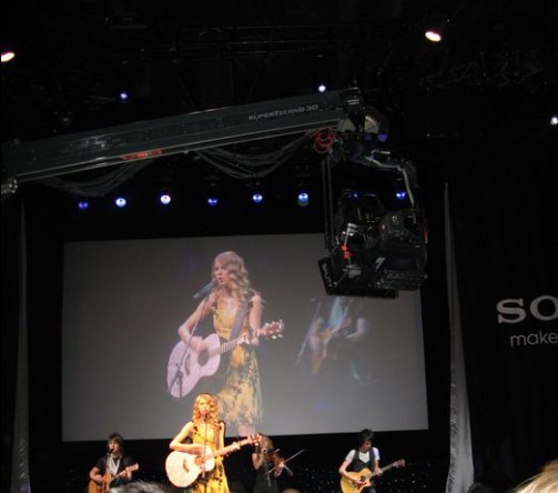 索尼董事長兼社長兼CEO霍華德·斯金格在兼作發布會現場的索尼展位上如此宣言之后,在美國備受年輕人歡迎的歌手Taylor Swift走上舞臺。會場上用能夠拍攝三維(3D)影像的專業攝像機拍攝了Swift的現場演奏,并在會場的屏幕上進行了3D現場直播。佩戴著3D影像用眼鏡的觀眾同時觀看了現場表演和3D影像。