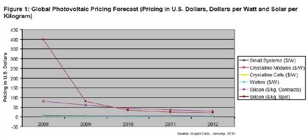 2009 年,光伏系統的平均價格下跌11%左右,而晶體硅組件的平均價格重挫了38%。iSuppli 公司預測,2010 年光伏系統的價格將下降10%,組件價格將再下跌20%。