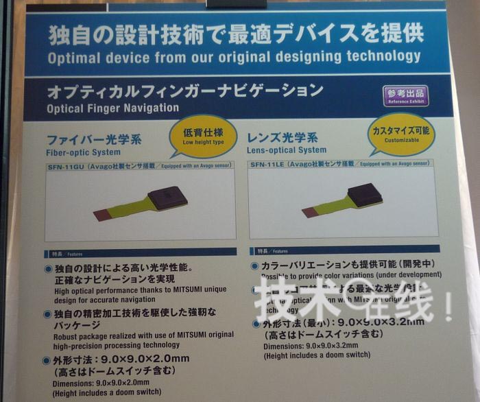 三美電機開發出了厚度僅為2mm的光學式輸入傳感器模塊“SFN-11GU”。設想用于用一根拇指在手機畫面上進行操作的用途。解說員表示,“如果是觸摸面板的話,大多數情況下需要一手拿著手機,用另一只手的手指碰觸畫面進行操作,而有些顧客希望可以只用單手進行操作”。該產品已經用于便攜終端產品中。