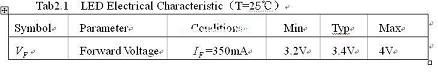其次,恒功率控制都是預(yù)先假定輸出功率是恒定的,比如用9個(gè)1W(=3.4V, =350MA)的LED串聯(lián)起來(lái)用做一個(gè)9W的PAR燈,那么設(shè)計(jì)時(shí)候就會(huì)用=9W來(lái)計(jì)算。但實(shí)際上每個(gè)LED的都會(huì)偏差,偏差值如表2.1所示: