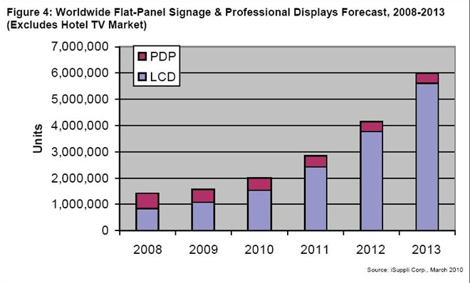 在今年出貨的將近大約200萬塊數字標牌和專業顯示器中,整整四分之三,即152萬塊將是液晶顯示器,其它的468752塊是等離子顯示器。