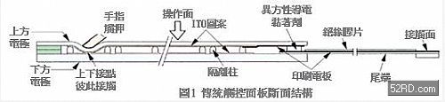 圖1是傳統(tǒng)阻抗式觸控面板的斷面結構,如圖所示,阻抗式觸控面板是在玻璃板內(nèi)側(cè)設置大小約5~10μm的隔離柱(spacer),隔離柱表面再黏貼厚度約200μm的PET膜片(sheet),玻璃板表面與PET膜片內(nèi)側(cè)設有縱橫直交的透明阻抗電極格子ITO(IndiumTinOxide),正常狀態(tài)玻璃板表面與PET膜片兩者被隔離柱隔離無法導通電氣。