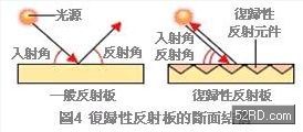 此時若在顯示器周圍設置復數(shù)個收光器,勢必會造成觸控面板制作成本暴增,有鑑于此,研究人員在顯示器周圍黏貼「復歸性反射板(ReturnReflectorSheet)」,它可以反射來自顯示器周圍任何方向的光線,亦即從感測器射出的任何光線都會折返至感測器,如果被筆或是手指遮蔽時,光線就不會折返至感測器(圖4)。