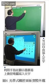 光學式觸控面板的設計必須考量雷射光線對人眼的安全,因此採用低功率半導體雷射,然而低功率半導體雷射卻會引發(fā)復歸光量不足等現(xiàn)象。此外,CCD會同時擷取燈泡與太陽等外部光線,必需透過軟體的信號處理技術克服。圖6是光學式觸控面板實際外觀。一般認為,大型光學式觸控面板非常適合應用在教育、運動以及各種商務簡報等領域。