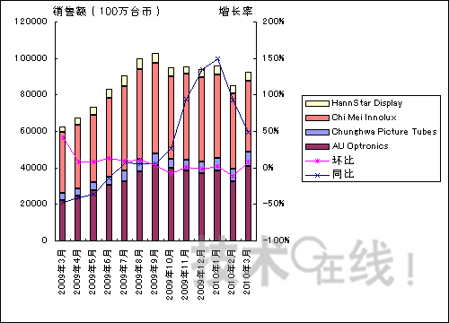 2010年3月臺灣四家大型液晶面板廠商的銷售額環比增加了9%。2010年3月18日由臺灣群創光電(Innolux Display)、原奇美電子(ChiMei Optoelectronics)和統寶光電(TPO Displays)合并成立的臺灣奇美電子(Chimei Innolux,CMI)3月份的銷售額不包括原奇美電子和統寶光電3月1日~3月17日的銷售額。如果加上這部分銷售額的話,預計四大廠商的合計銷售額將環比增加25%左右。