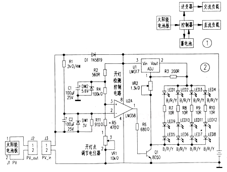 考慮到生產(chǎn)成本,電路中未設(shè)計(jì)蓄電池過充電控制電路。而蓄電池過放電控制原理則是充分利用了LED發(fā)光二極管的導(dǎo)通“勢壘”來實(shí)現(xiàn)的,雖未加蓄電池過放控制電路,同樣也能實(shí)現(xiàn)蓄電池的過放電保護(hù)功能。