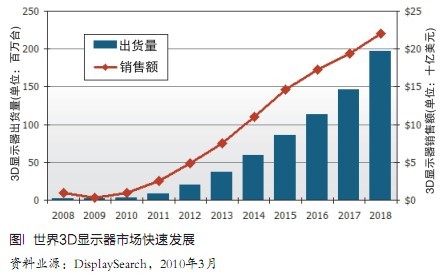 市場(chǎng)研究公司DisplaySearch日前發(fā)表一份專(zhuān)門(mén)報(bào)告稱(chēng),在3D電影成功的促動(dòng)下,3D顯示器市場(chǎng)將于2010年開(kāi)始起飛,預(yù)測(cè)3D顯示器出貨量將從2008年的70萬(wàn)個(gè)增長(zhǎng)到2018年的1.96億個(gè),10年內(nèi)年均增長(zhǎng)率達(dá)75%,同期銷(xiāo)售額從9億美元增長(zhǎng)到220億美元,年均增長(zhǎng)率38%(圖1)。世界消費(fèi)電子廠(chǎng)商將隨著推出一批3D有關(guān)產(chǎn)品,包括電視機(jī)、監(jiān)視器、筆記本電腦、藍(lán)光盤(pán)播放器、數(shù)碼相機(jī)、攝像機(jī)、相框等進(jìn)軍家庭市場(chǎng)。加上立體顯示原來(lái)就有的醫(yī)療等專(zhuān)業(yè)應(yīng)用以及廣告、公共顯示牌等應(yīng)用,都會(huì)成為促動(dòng)顯示產(chǎn)業(yè)開(kāi)始從平板產(chǎn)品向著3D大進(jìn)軍,這也是一次從平板顯示轉(zhuǎn)向立體顯示的革命。