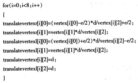 按上述投影算法計(jì)算出立體圖像對(duì)后,應(yīng)用OpenGL繪制立體圖像對(duì),分別用紅、綠兩種顏色繪制右眼和左眼的圖像。以一個(gè)變長(zhǎng)為10cm,中心點(diǎn)在原點(diǎn)的正方體為例,設(shè)兩視點(diǎn)間距離e為5cm,投影面距高觀察者d為40cm,考察正方體的一個(gè)頂點(diǎn)(5,5,5),由上述投影算法可得:xr=32cm,xl=48cm,yl=yr=4040cm,zr=zl=d=40cm對(duì)8個(gè)頂點(diǎn)分別計(jì)算后,連接相應(yīng)的立體透視投影點(diǎn),即可得該立方體的立體圖像對(duì)。用數(shù)組vertex[8][3]存儲(chǔ)頂點(diǎn),數(shù)組translatevertexr[8][3]存儲(chǔ)右眼投影計(jì)算后坐標(biāo),數(shù)組translatevertexl[8][3]存儲(chǔ)左眼投影計(jì)算后的坐標(biāo),對(duì)相應(yīng)的點(diǎn)進(jìn)行投影計(jì)算: