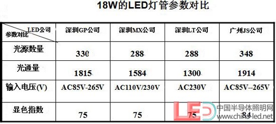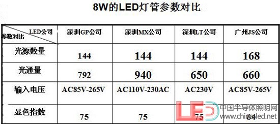 通過上面的表格可以看出,以上我們?nèi)我膺x擇的四家公司的LED燈管的相關(guān)結(jié)果數(shù)據(jù)有的參數(shù)會有會有一定的差別,選用LED光源的數(shù)量從144-168顆,光通量也從650-940LM,相差的范圍有290LM之多,輸入的電壓有寬電壓,也有窄電壓。顯色指數(shù)基本在Ra=75左右,國家LED燈具標(biāo)準(zhǔn)出臺后會有一個標(biāo)準(zhǔn)和規(guī)范。以上為各廠家自行測試結(jié)果(如上圖所示)