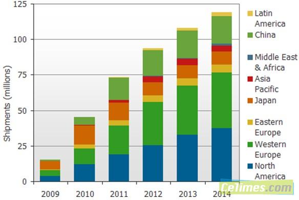 圖一:2009年~2014年聯網電視在不同區域的預估