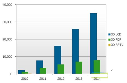 圖一:2010-2014 3D電視按不同應用技術出貨量預測(單位:千臺)