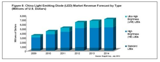 另外,憑借政府的支持和LED日益進入液晶電視及普通照明等新的應用領域,iSuppli公司預測,2014年中國LED營業收入將達到71億美元,而2009年是34億美元,其間的復合年度增長率為12.8%。超高亮度(UHB)LED的增長速度更快,到2014年銷售額將從2010年的6.86億美元上升到18億美元,復合年度增長率為26.9%。