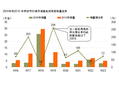 另一方面,我們可以看到,第20周到第23周50城市液晶市場的同比增長率仍然相當可觀,這是得益于6月開幕的世界杯。今年國內首次全高清直播的世界杯比賽,極大地調動了球迷們的熱情,而3D信號的轉播傳聞更是推動了勞動節期間3D液晶電視的銷售:節日期間3D型號的LED電視共計銷售3000余臺,對于以絕對高端登場的產品來說,是一個非常不錯的成績。雖然之后國內3D信號未能如預期般開播,但仍然有不少球迷購入了平板電視,為的是享受一屆高清的世界杯,這正如前文所述,國內消費者對于新生事物永遠不乏追捧的熱情。世界杯成了五月底六月初國內液晶電視市場最好的催化劑,高清世界杯作為最大的賣點,為節后的淡季市場注入了活力。