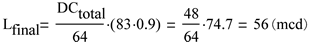 從上可見,運用48的組合點校正值即可得到56mcd的期望亮度。請注意,由于溫度引起亮度下降,故本計算中的起始電流被設置為起始生產電流的90%。