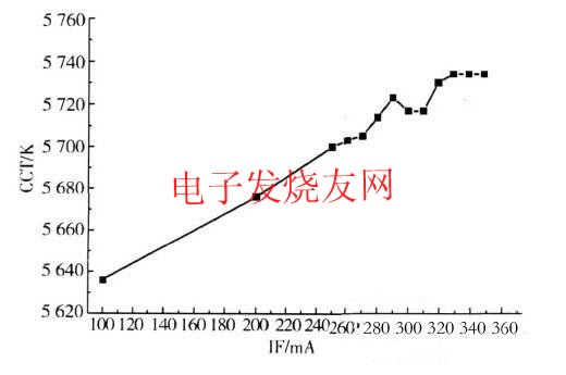 從圖2中可以看出,隨著器件的驅動電流增加,功率型白光LED的色溫從100mA電流時的5636K增加到350mA電流時的5734K。這是因為,電流加大后,芯片發出的藍光增多,熒光粉層的厚度是一定的,則在出射的白光中藍光成份增加,從而使器件的色溫增加。