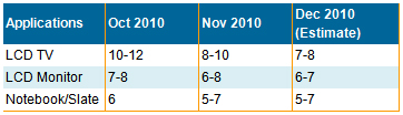 在美國,2010年第四季度零售市場銷售活躍,CCFL背光機(jī)種為主要熱銷產(chǎn)品,但該市場并未緩減所有品牌商的庫存壓力。大部分品牌商都仍面臨著LED背光液晶電視模塊居高不下的庫存問題。因此我們估計(jì)在2011年第一季度,品牌商將會(huì)趕在3月份新模塊上線前,加大促銷力度重點(diǎn)投放LED背光液晶電視。在中國,截止12月末,假期期間良好的銷售有效地減緩了庫存壓力,我們估計(jì)液晶電視庫存將在12月底降低到中等水平。