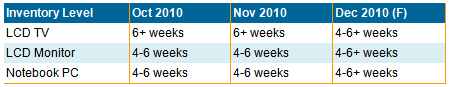 盡管11月份之前液晶顯示器庫存量處于中等水平,但主要液晶顯示品牌商重點(diǎn)投放的中國市場卻銷售緩慢,從而導(dǎo)致了2010年年底庫存量上升。