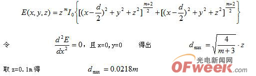 d增加到0.0218時,原點附近的區域的光照度不至下降很多,此距離比較合適。通過仿真可以驗證計算結果,如圖1所示,當d=0.0218m時,原點附近照度較均勻。 [page]