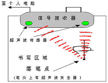 超聲波技術(shù)的原理是:利用超聲波的傳輸速度較慢的特性,根據(jù)超聲波發(fā)射到接收時(shí)間計(jì)算出發(fā)射點(diǎn)到接收點(diǎn)的距離。使用在平面定位上的原理采用的是在屏幕的一邊放置兩個(gè)按固定距離分布的超聲接收裝置,用于定位的筆是一個(gè)超聲波發(fā)射器,當(dāng)筆移動在屏幕的表面時(shí),所發(fā)射的超聲波沿屏幕表面被接收器檢測到,由收到超聲波的時(shí)間可以換算出筆與兩個(gè)接收器的距離。采用三點(diǎn)定位的原理,即根據(jù)三角形已知三個(gè)邊長可以確定筆所在的頂點(diǎn)原理,計(jì)算出筆所在的位置坐標(biāo)。是一種測距定位模式。