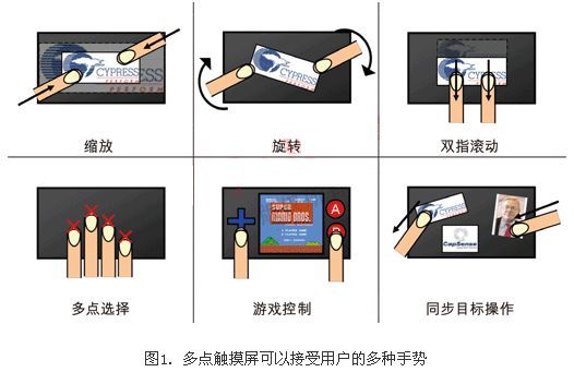 用投射式觸摸屏實現的幾種常見的多點觸摸手勢包括手指的張合、縮放、雙指的滑動和旋轉。它們可以快速方便地處理數據、內容和用戶參數。便攜游戲和文本/電子郵件應用也可以利用多點觸摸技術。在一個多指觸摸過程中,多觸點APA(全點可尋址)模式可以精確地測定每個手指所按壓的坐標位置。